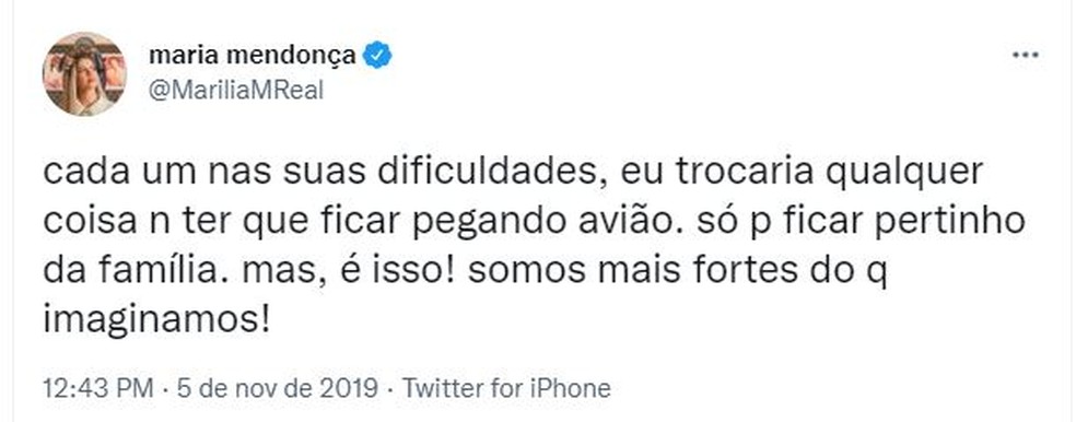 Em 5 de novembro de 2019, exatamente dois anos antes de ter morrido na queda de um avião de pequeno porte, a cantora Marília Mendonça fez o seguinte post numa rede social: “Cada um nas suas dificuldades, eu trocaria qualquer coisa para não ter que ficar pegando avião. Só para ficar pertinho da família. Mas é isso! Somos mais fortes do que imaginamos!”.